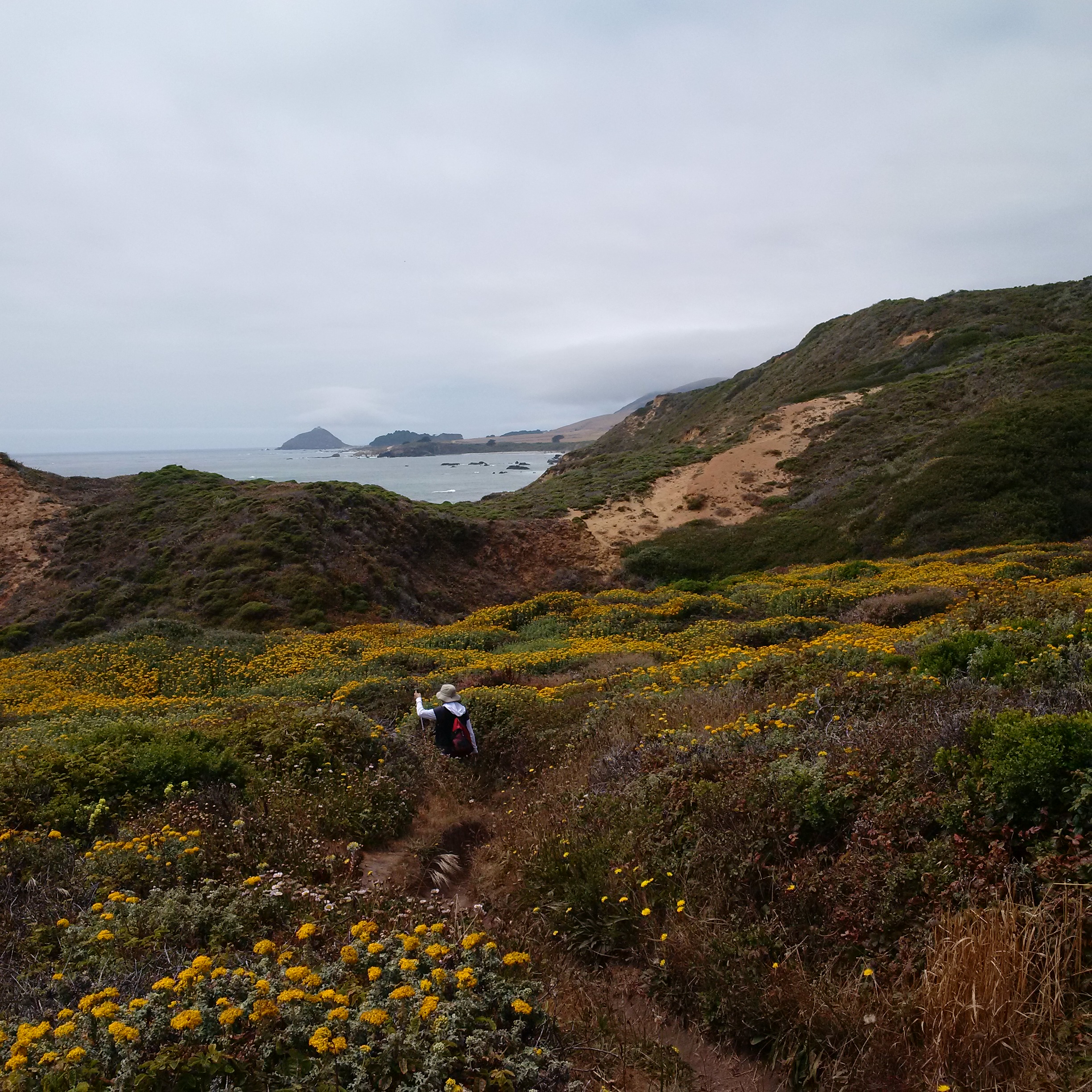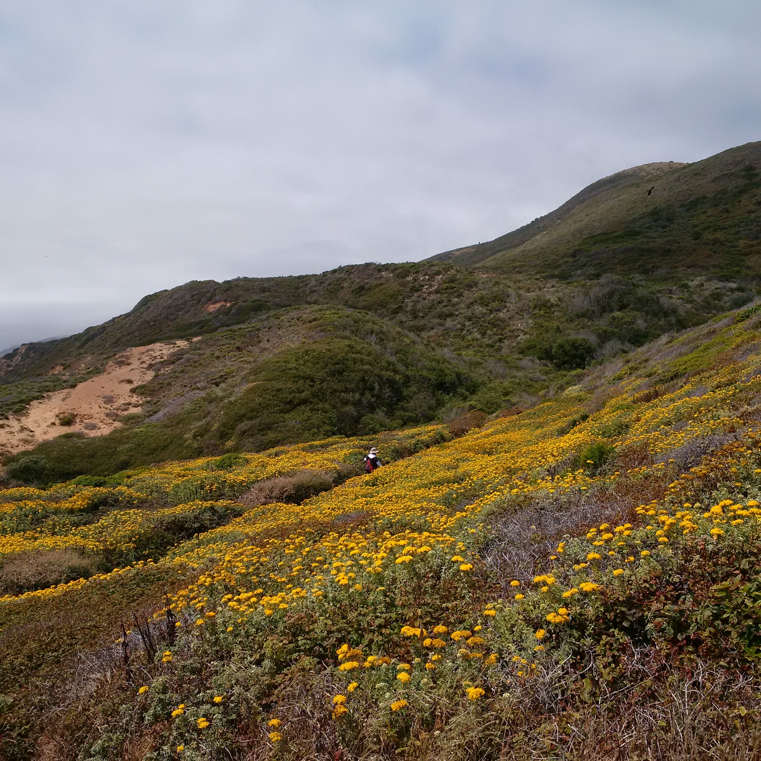 Approaching the half way point, we were greeted by a fantastic panoramic landscape. The whole Pacific Ocean opens up and we can see the shoreline trail snakes in and out of the fields of blooming yellow wildflowers, covering the hillside. As if this is not enough candy for the eyes, the sun is out, the sandy beaches are pristine and there is no crowd! There is even a beach with pink sand! As we hike home, we realize doing the loop is much better this way since the scenery is always in front of us (rather than behind). Thanks to the Major, even Scott would have enjoyed this hike!